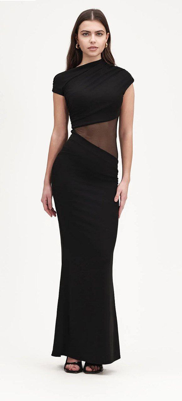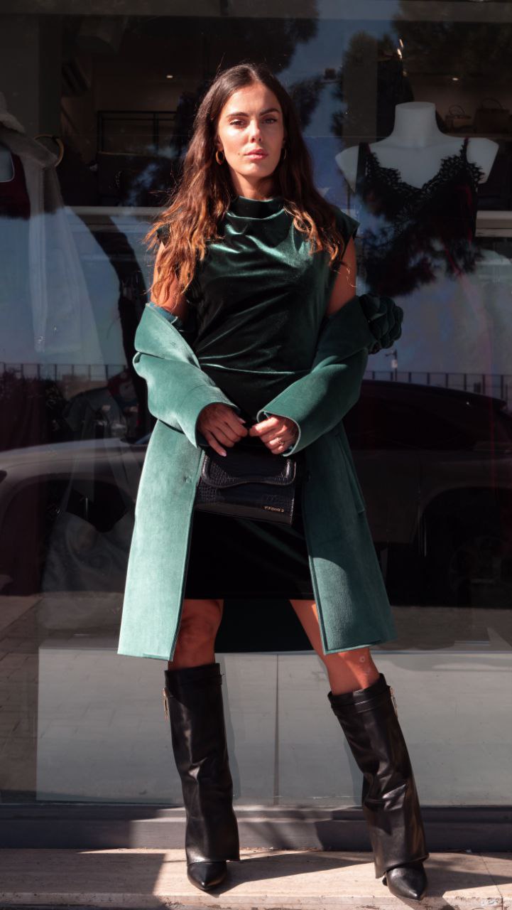 Elegante abito lungo in verde e nero, perfetto per occasioni speciali. Realizzato in tessuto morbido...
