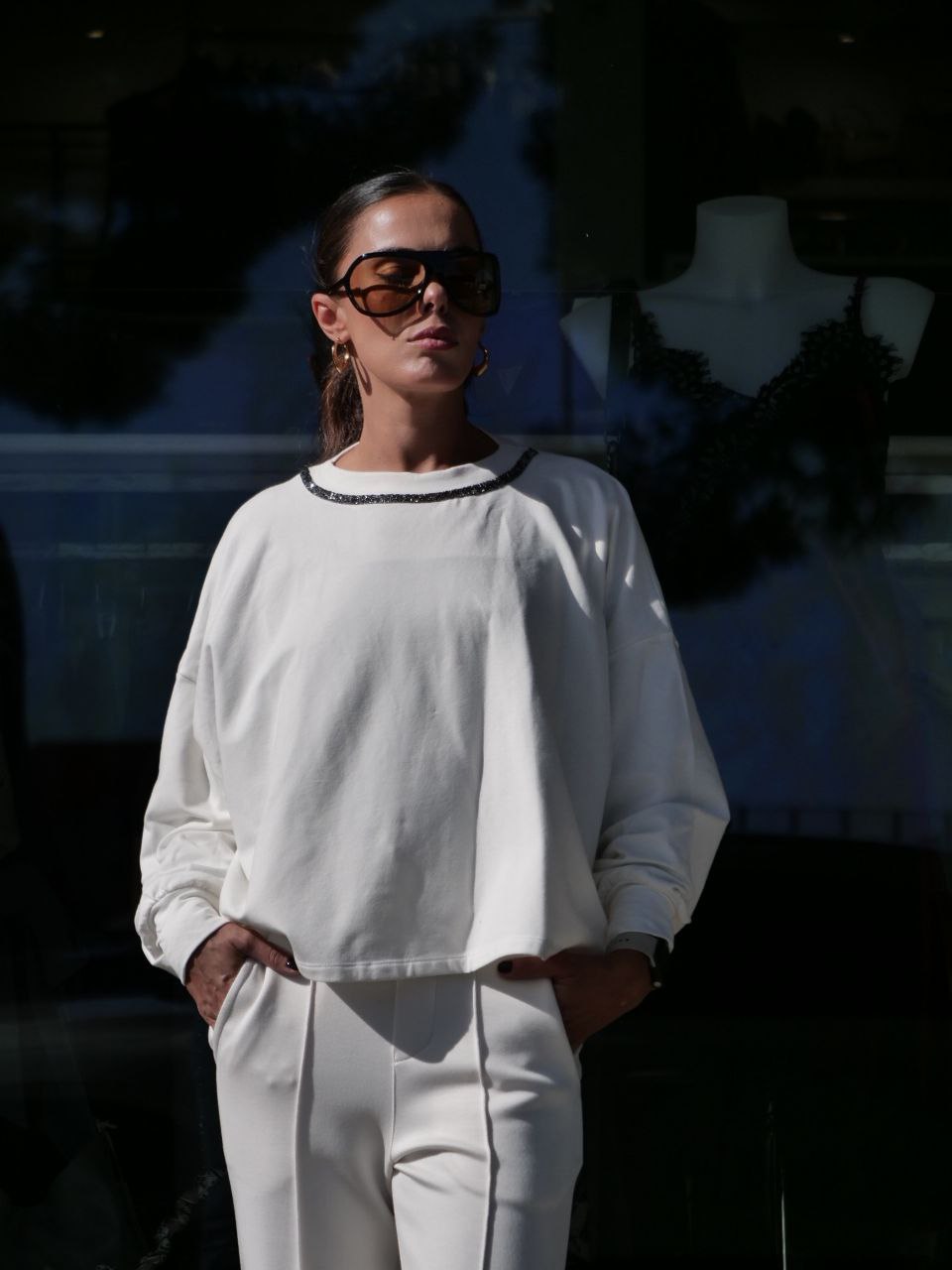 Scopri il completo felpa e pantalone Whitewise, perfetto per un look casual e alla moda....
