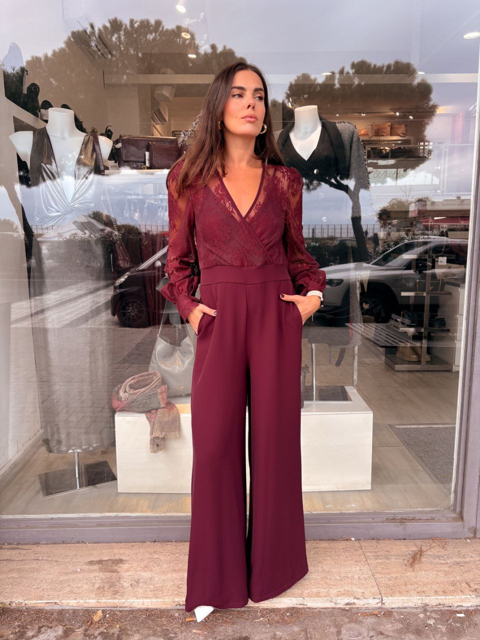 Elegante tuta lunga con dettagli in pizzo, perfetta per ogni occasione. Realizzata in tessuto morbido...