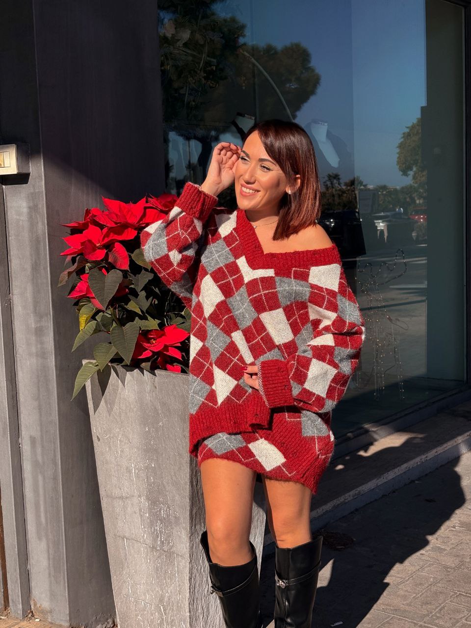 Completo Maglia e Gonna a Righe con Motivo a Rombi