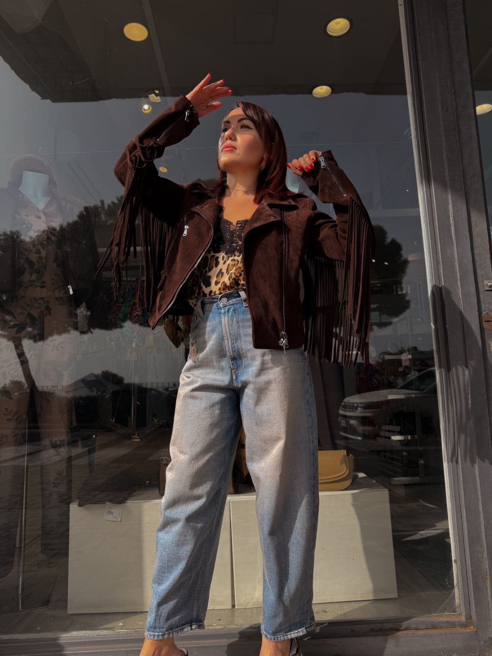 Elegante giacca in vera pelle e dainetto, caratterizzata da frange che aggiungono un tocco di...
