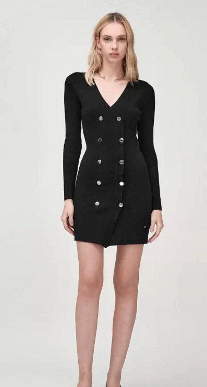 Elegante abito in maglia doppiopetto con bottoni argentati, perfetto per ogni occasione. Realizzato in un tessuto morbido e confortevole, questo abito valorizza la figura con il suo design chic e moderno.