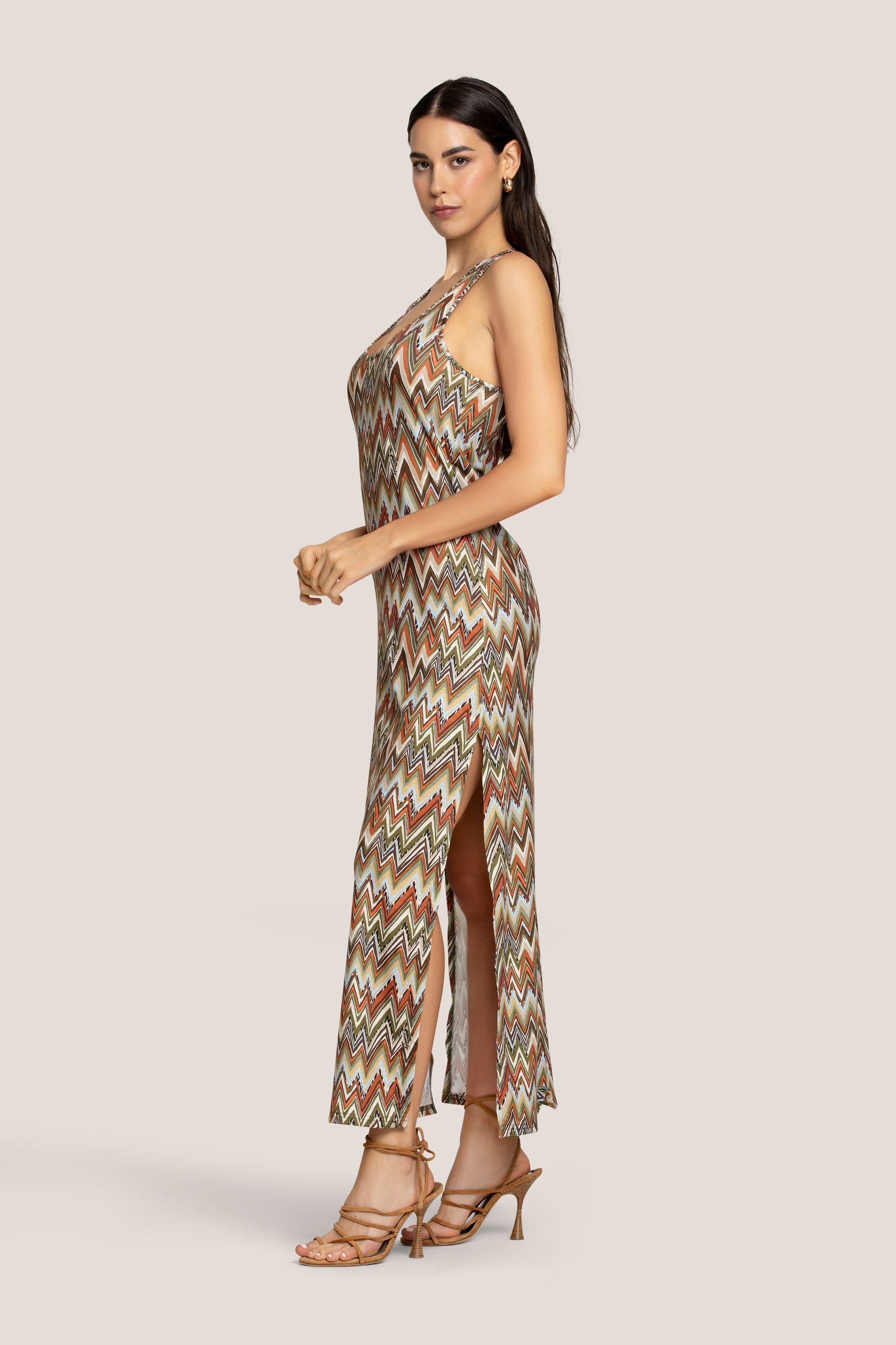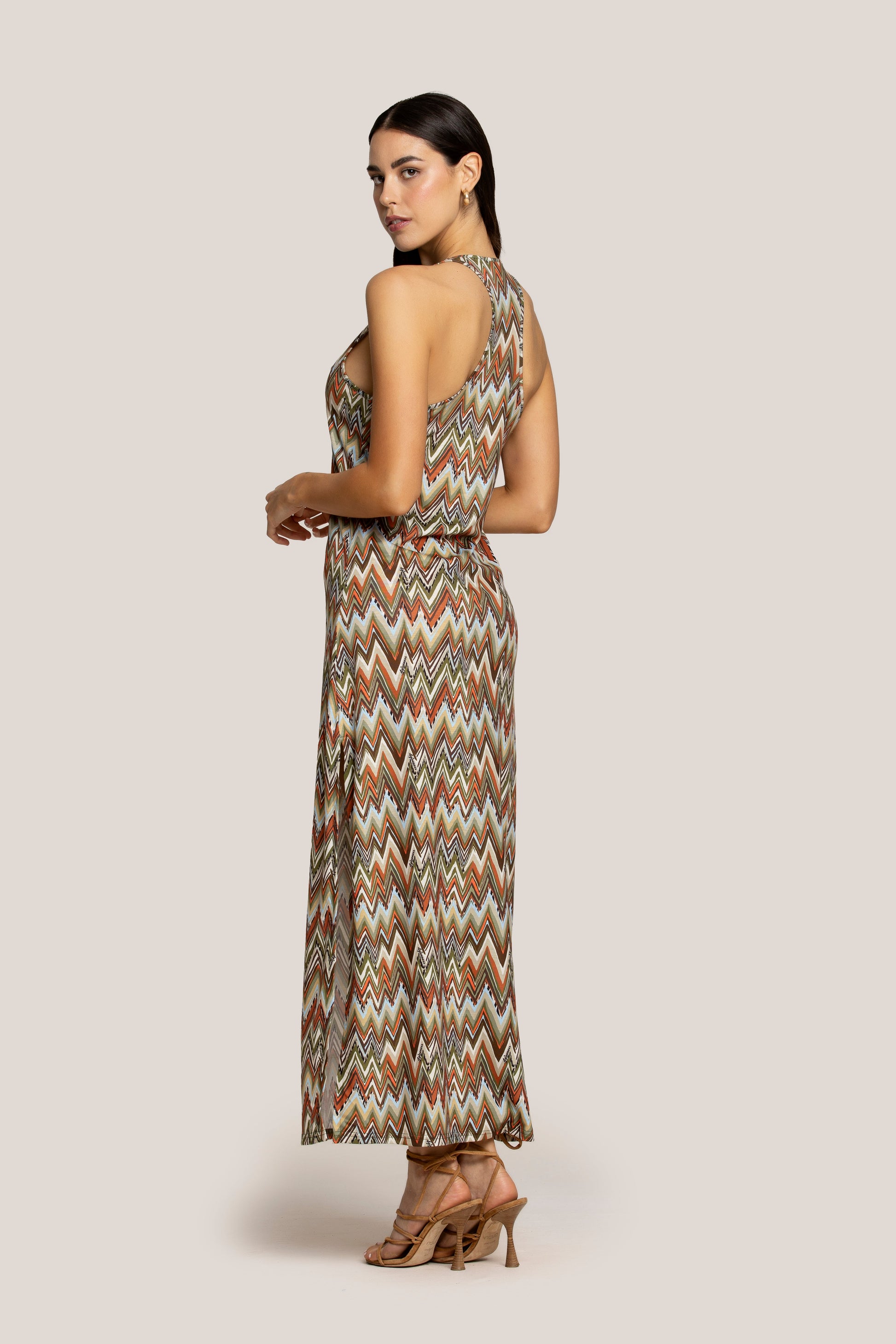 Abito lungo canotta Geometrical Net, elegante e sofisticato, con spacchi laterali per un tocco di sensualità e movimento. Composizione: 95% PL, 5% EA. La modella indossa una taglia S.
