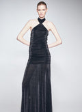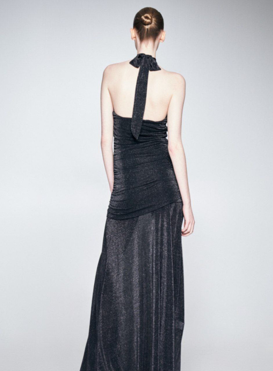 Elegante abito lurex in grigio, caratterizzato da un design con scollo halter e una silhouette aderente che valorizza la figura. Perfetto per occasioni speciali, questo abito è realizzato in un tessuto scintillante che cattura la luce, rendendolo ideale per serate indimenticabili.