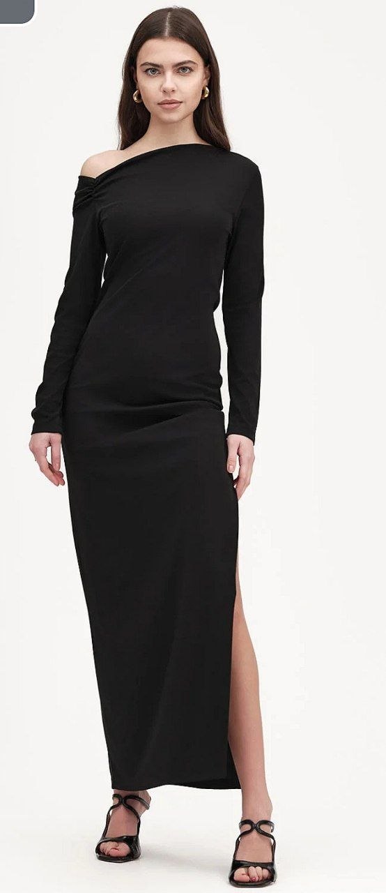 Elegante abito lungo in colore nero, perfetto per ogni occasione. Realizzato in un tessuto morbido e confortevole, questo abito presenta uno spacco laterale che aggiunge un tocco di sensualità. Disponibile in due taglie, XS e S, per adattarsi a diverse silhouette.