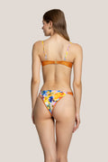 Bikini con top a balconcino che unisce supporto e stile, caratterizzato da coppe con inserzioni in tessuto arancio metallizzato che donano un tocco luminoso e sofisticato. Il design è completato da slip con lacci laterali realizzati nello stesso tessuto arancio metallizzato, in contrasto con la vivace fantasia Digital Flower per un look deciso e femminile.