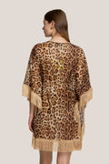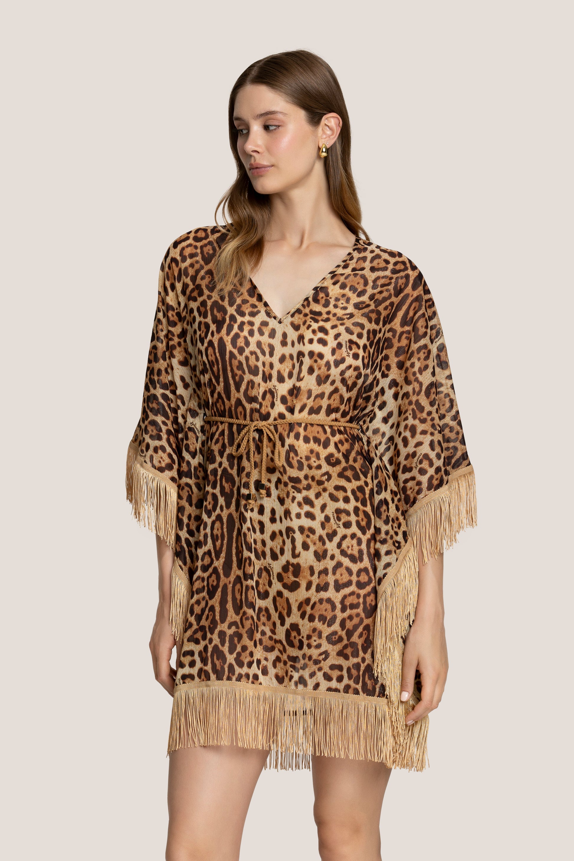 Caftano in fantasia oro leo con maniche larghe con bordo a contrato Materiale: 100% poliestere Caratteristiche: Elegante e sofisticato Leggero e traspirante Taglia unica