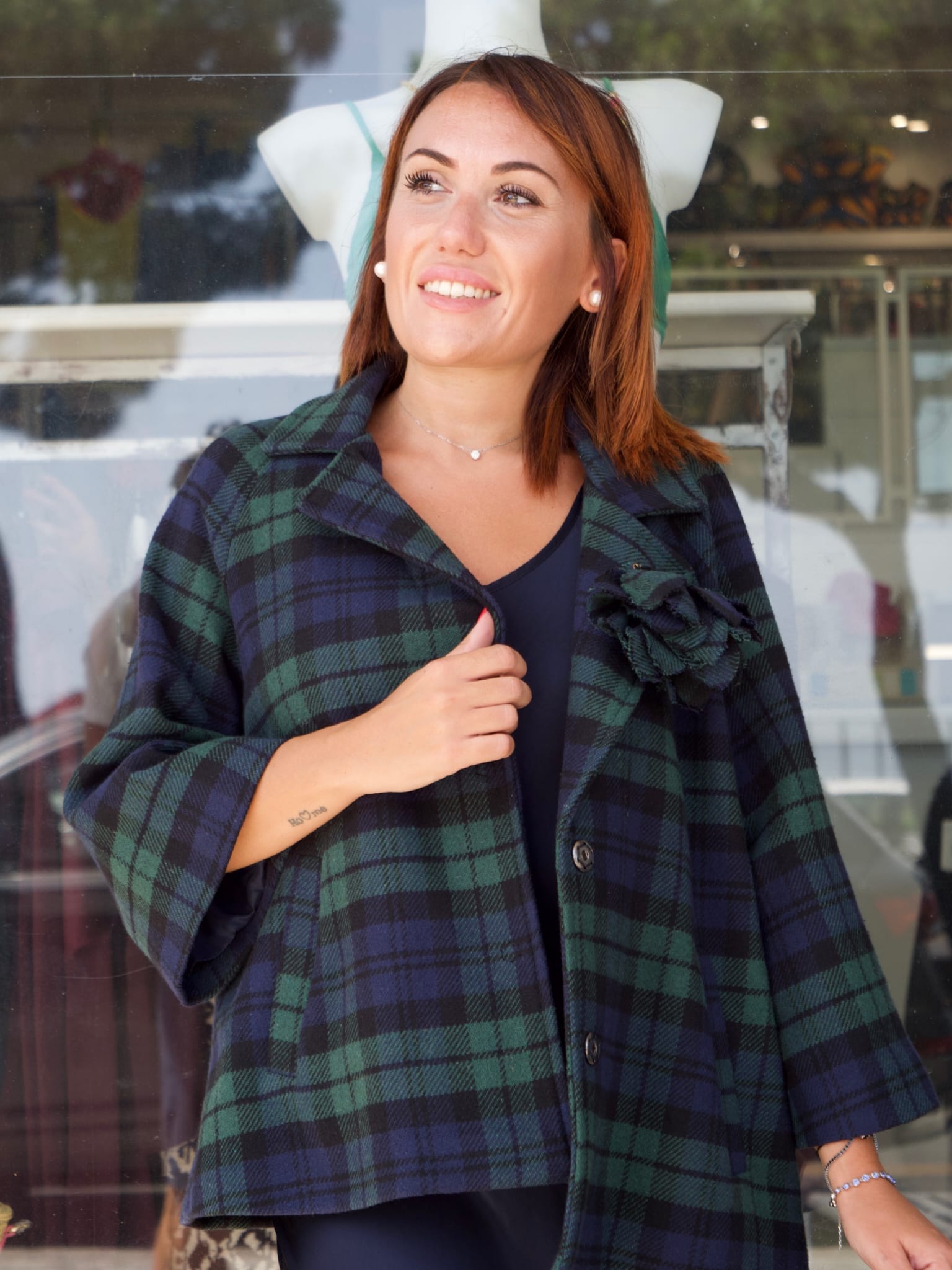 Un cappottino dallo stile senza tempo che unisce la tradizione del tartan scozzese con un design moderno e raffinato. Realizzato in morbido tessuto caldo, presenta una linea fluida e avvolgente, ideale per valorizzare ogni silhouette. Le maniche ampie a 3/4 donano comfort e movimento, mentre l’applicazione floreale sul petto aggiunge un dettaglio femminile e ricercato. Facile da abbinare sia a un look casual con jeans e stivaletti, sia a un outfit elegante da sera.
