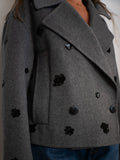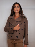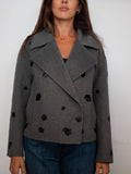 Cappotto corto di Vicolo, elegante e versatile, perfetto per ogni occasione. Realizzato in un caldo tessuto grigio con dettagli marroni e applicazioni floreali, questo cappotto è un must-have per il tuo guardaroba invernale.