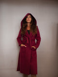 Cappotto elegante Whitewise in colore bordeaux, dotato di cappuccio e cintura in vita. Perfetto per le giornate fredde, offre comfort e stile. Disponibile in diverse taglie per adattarsi a ogni silhouette.