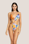 Costume intero dallo stile vivace e moderno, caratterizzato da una coppa in arancio metallizzato che dona luminosità e un tocco glamour. Il resto del bikini è realizzato in una colorata fantasia Digital Flower, per un look estivo audace e femminile.