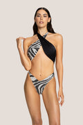 - Monokini intero con doppia fascia nera e in fantasia zebra da annodare al collo e slip sgambato a V