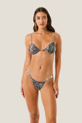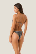 Bikini donna in Lurex stampato effetto animalier, con top minimal arricciato lateralmente e laccetti fissi che si chiudono con un laccetto dietro la schiena. Lo slip chiuso con leggero taglio a V scolpisce delicatamente la silhouette, valorizzandola con eleganza. Il dettaglio metallico argento posizionato sul punto vita e al centro del seno dona luminosità e un tocco prezioso. Un modello moderno e femminile, perfetto per chi cerca un bikini raffinato e di tendenza.